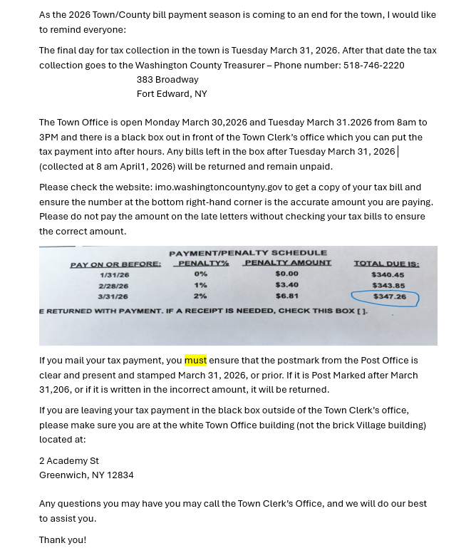 TAKE NOTICE, that I, Deborah Tjarks, the undersigned Collector of Taxes of the Town of Greenwich, County of Washington and State of New York, have duly received the tax roll and warrant for the collection of taxes within the Town of Greenwich for the year 2026. I will attend my office at 2 Academy Street, Greenwich, NY, beginning Wednesday, January 1, 2026, on Mondays, Tuesdays, Wednesdays from 8 a.m. to 3 p.m., Thursdays from Noon. to 7 p.m., Fridays from 8 a.m. till 12 Noon, excepting Saturdays, Sundays and holidays for the purpose of receiving the taxes listed on said roll.